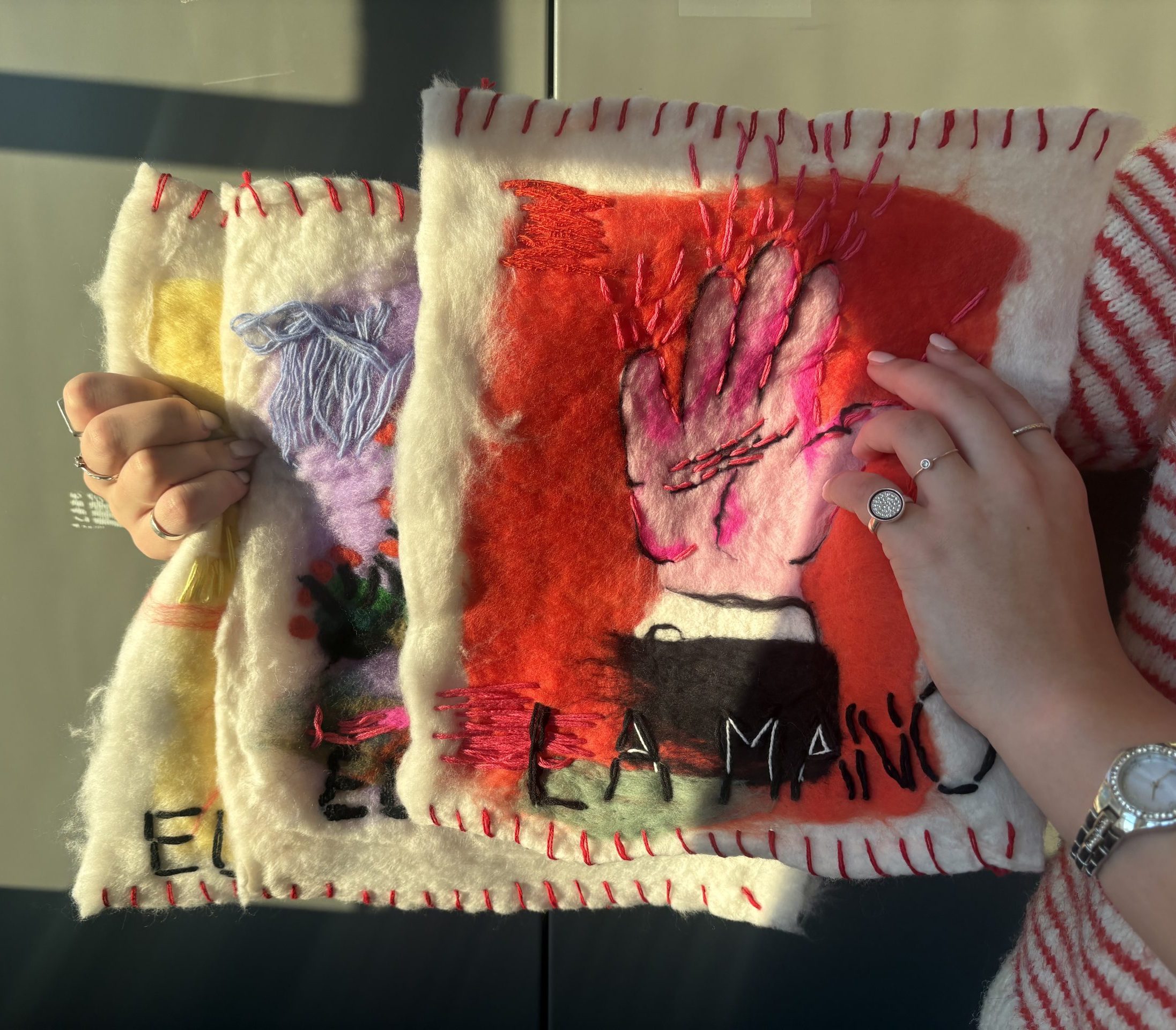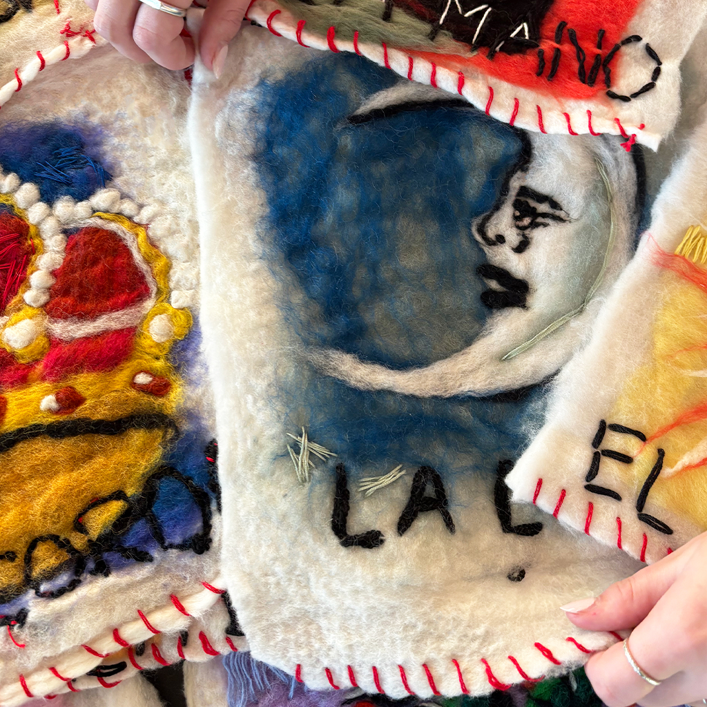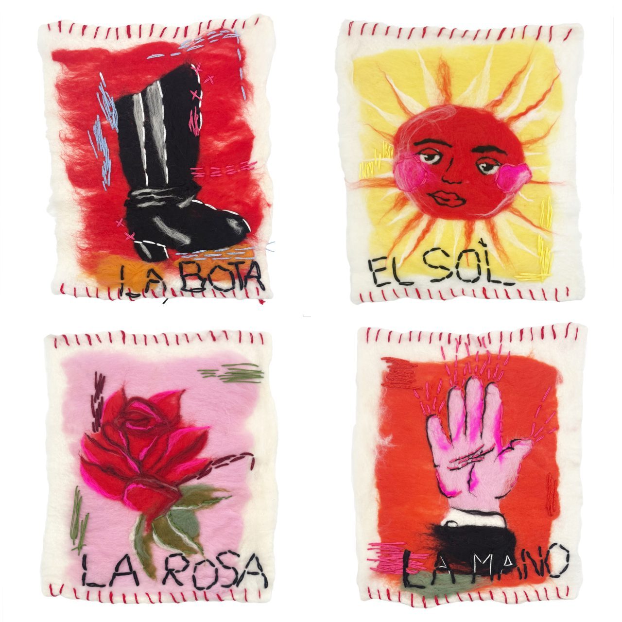 La Lotería is a large-scale felted textile interpretation of cards from the Mexican board game, La Lotería. Inquire for purchase, sold individually.