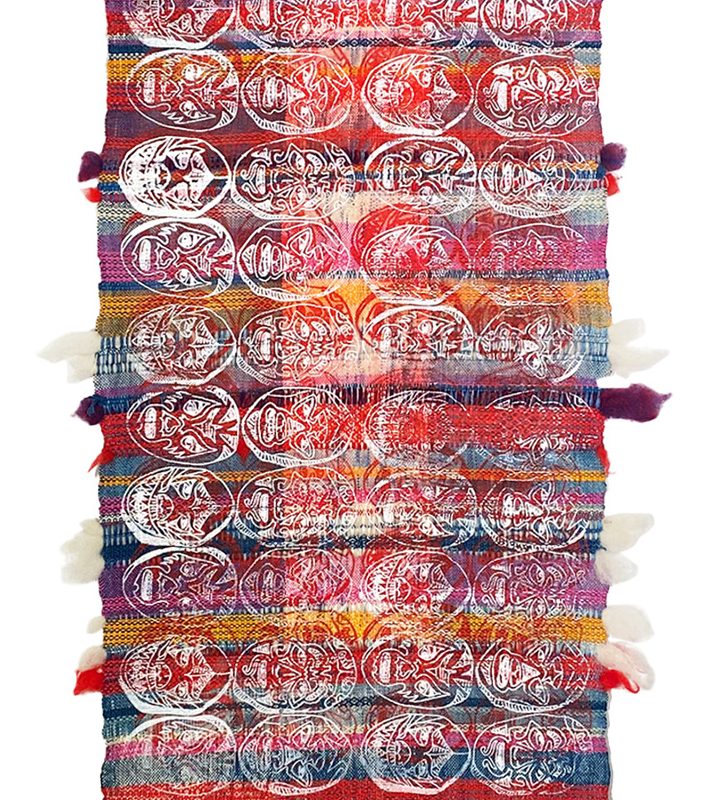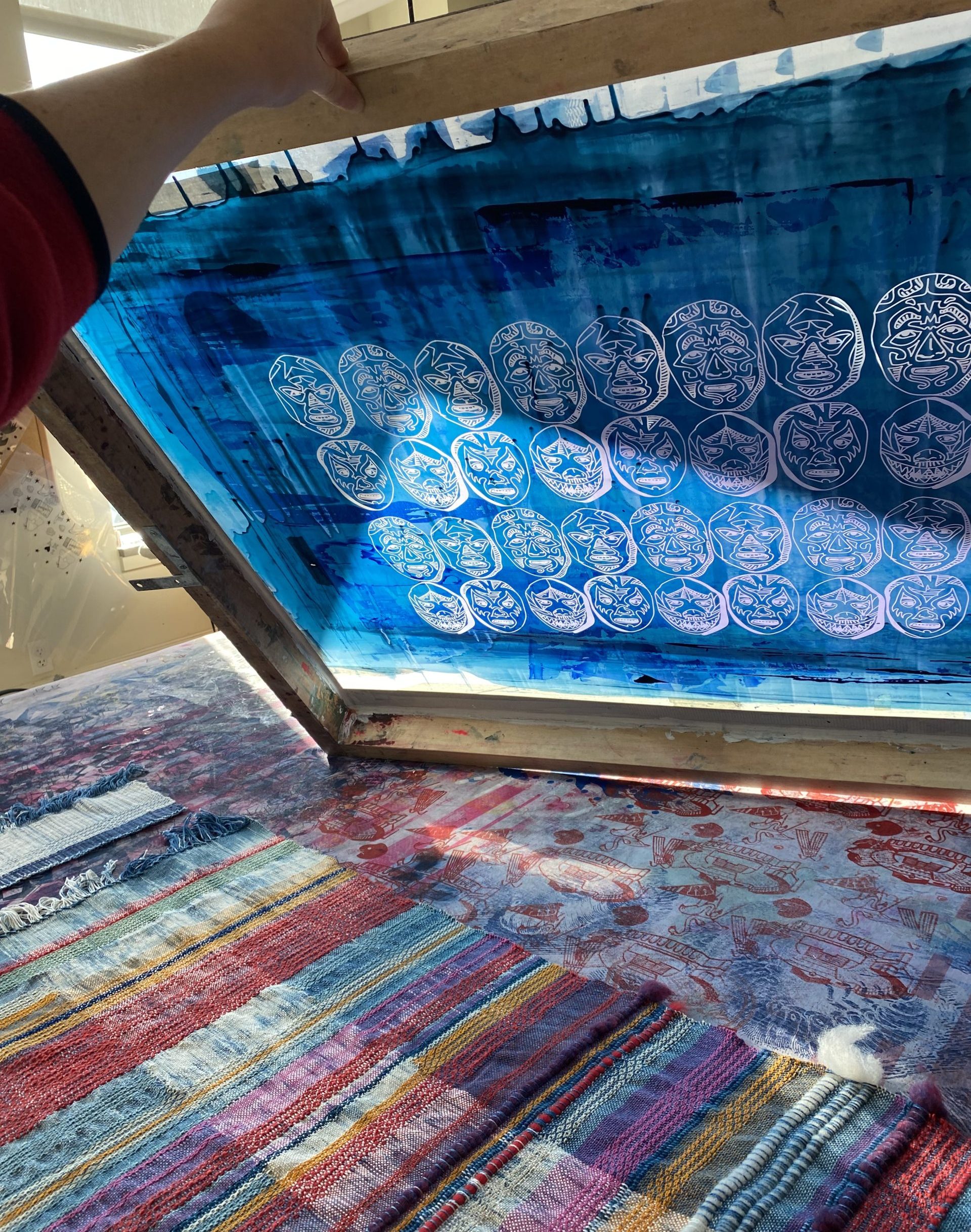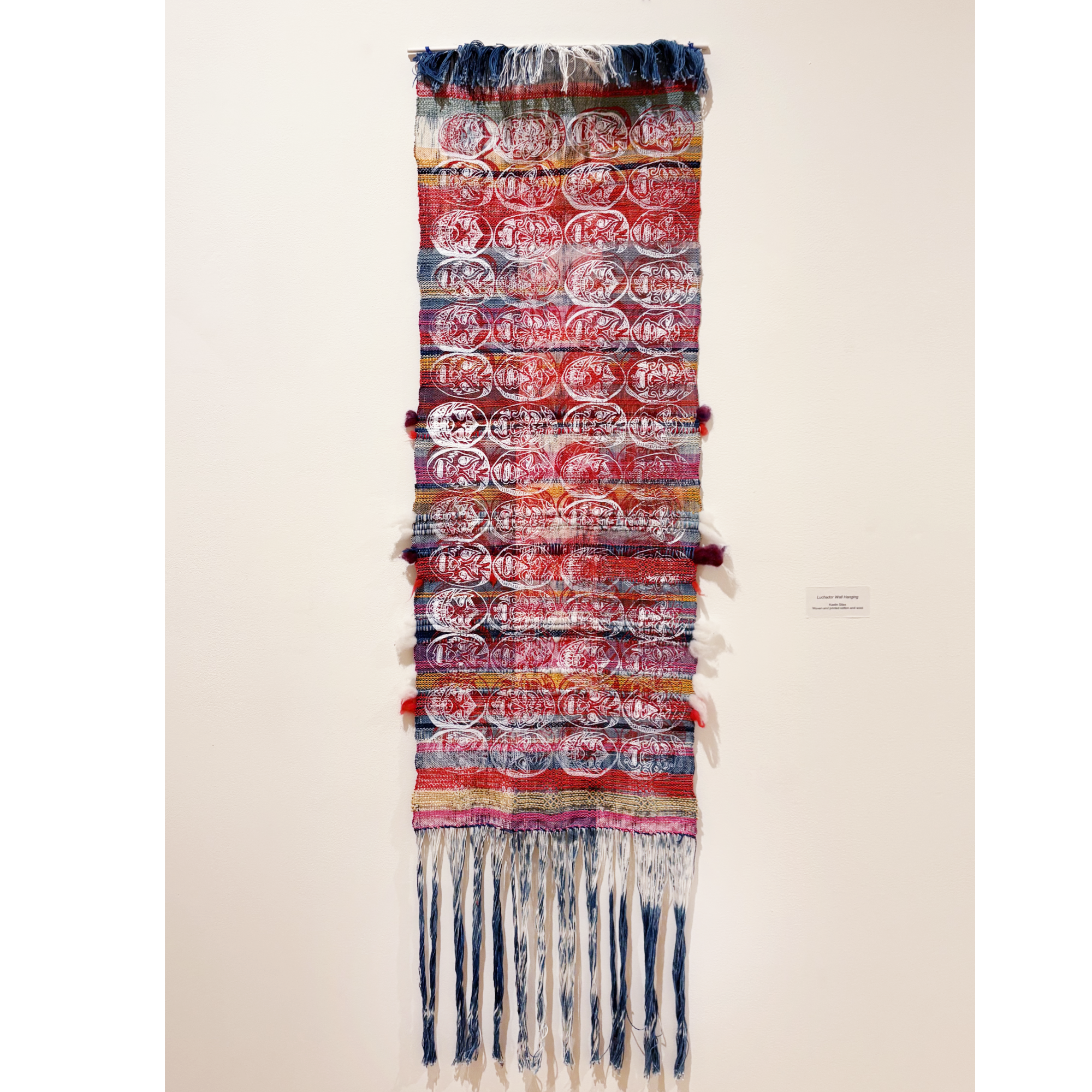Wall hanging woven from wool and cotton yarns in a traditional rose patch block pattern. Warp yarns dyed in indigo with resist techniques. Screen printed with pattern digitally designed by artist. Featured in the annual juried Student Art Show hosted by the university union(2024). Inquire for purchase.