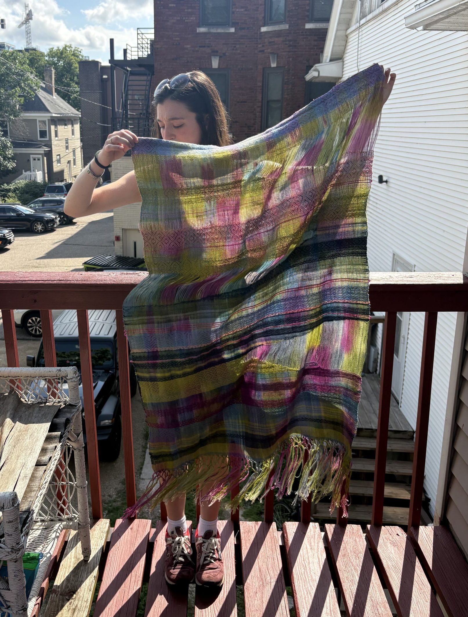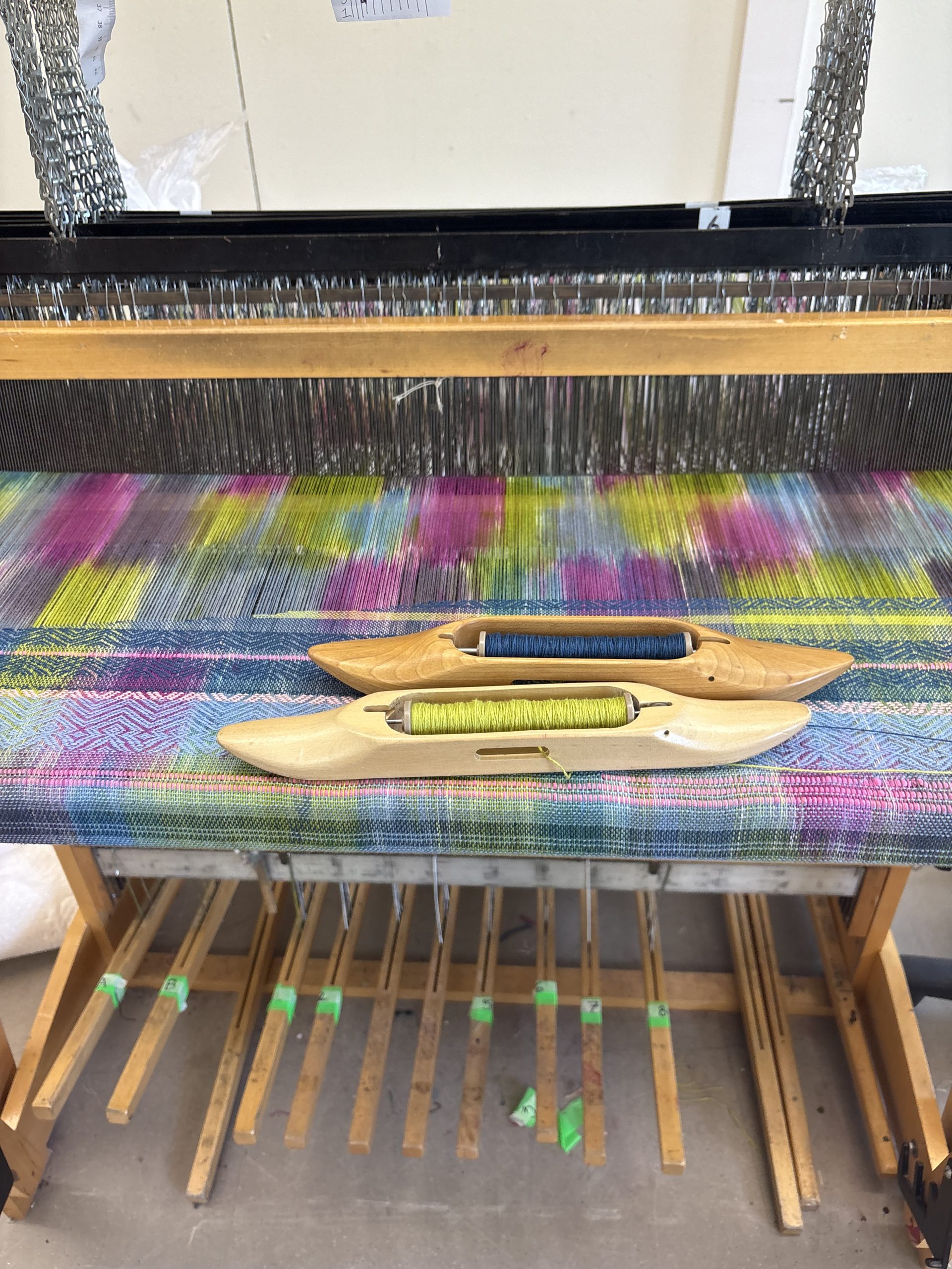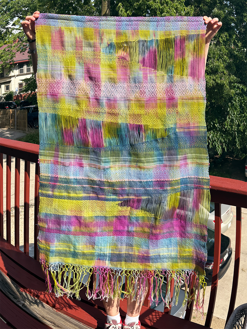 Third weaving experimenting with open warp. This warp was hand painted. SOLD.