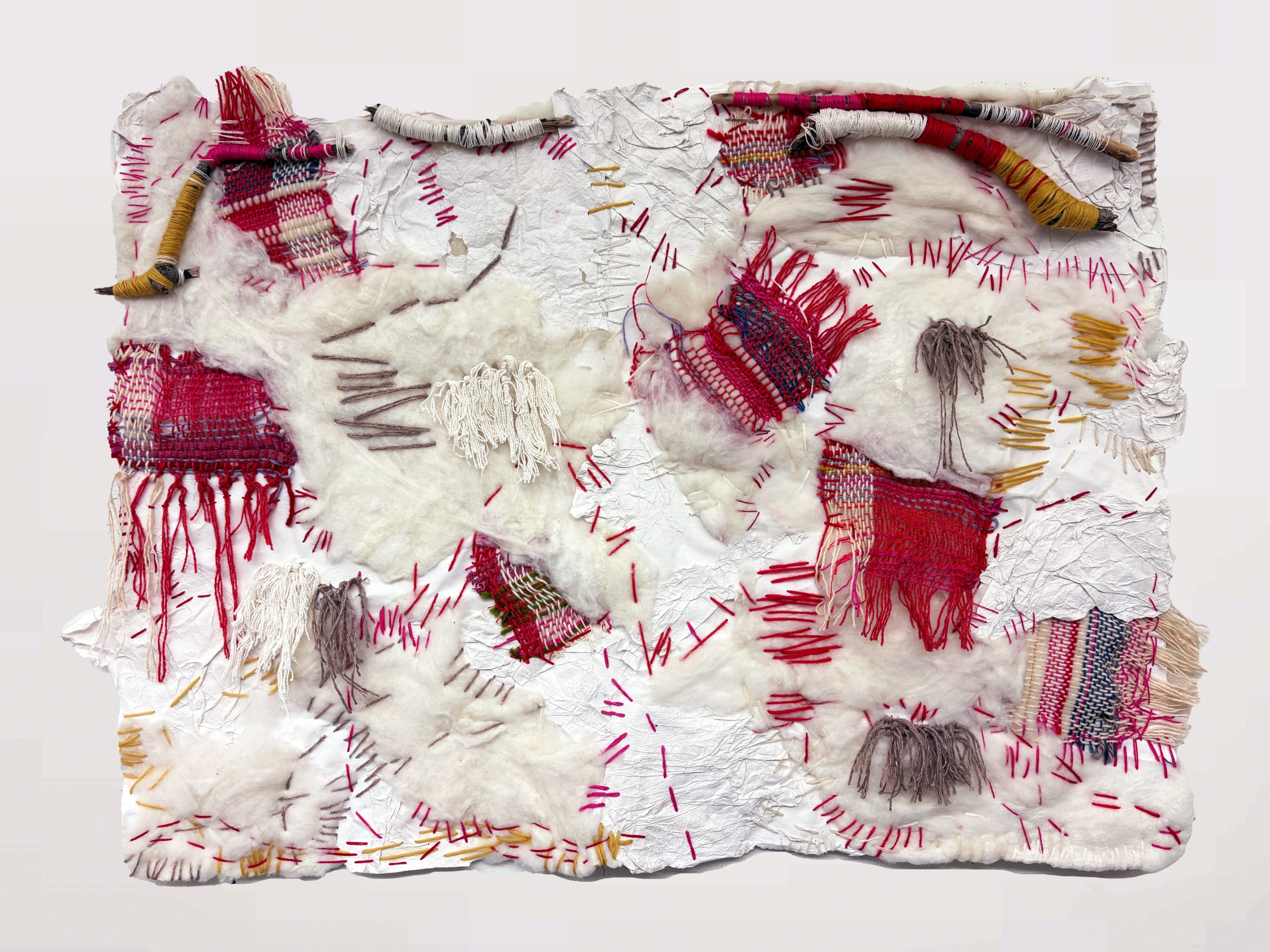 Wash, Pull, Stitch is a multi-media textile work that embraces the slow processes of hand papermaking, felting, and stitching. Wool renewably sourced from Arlington, WI Sheep Research Station and cotton pulp renewably sourced from cotton waste material. First place winner of the annual Nelson Institute for the Environment Arts Competition(2025). Sold.