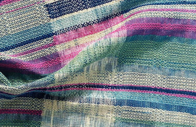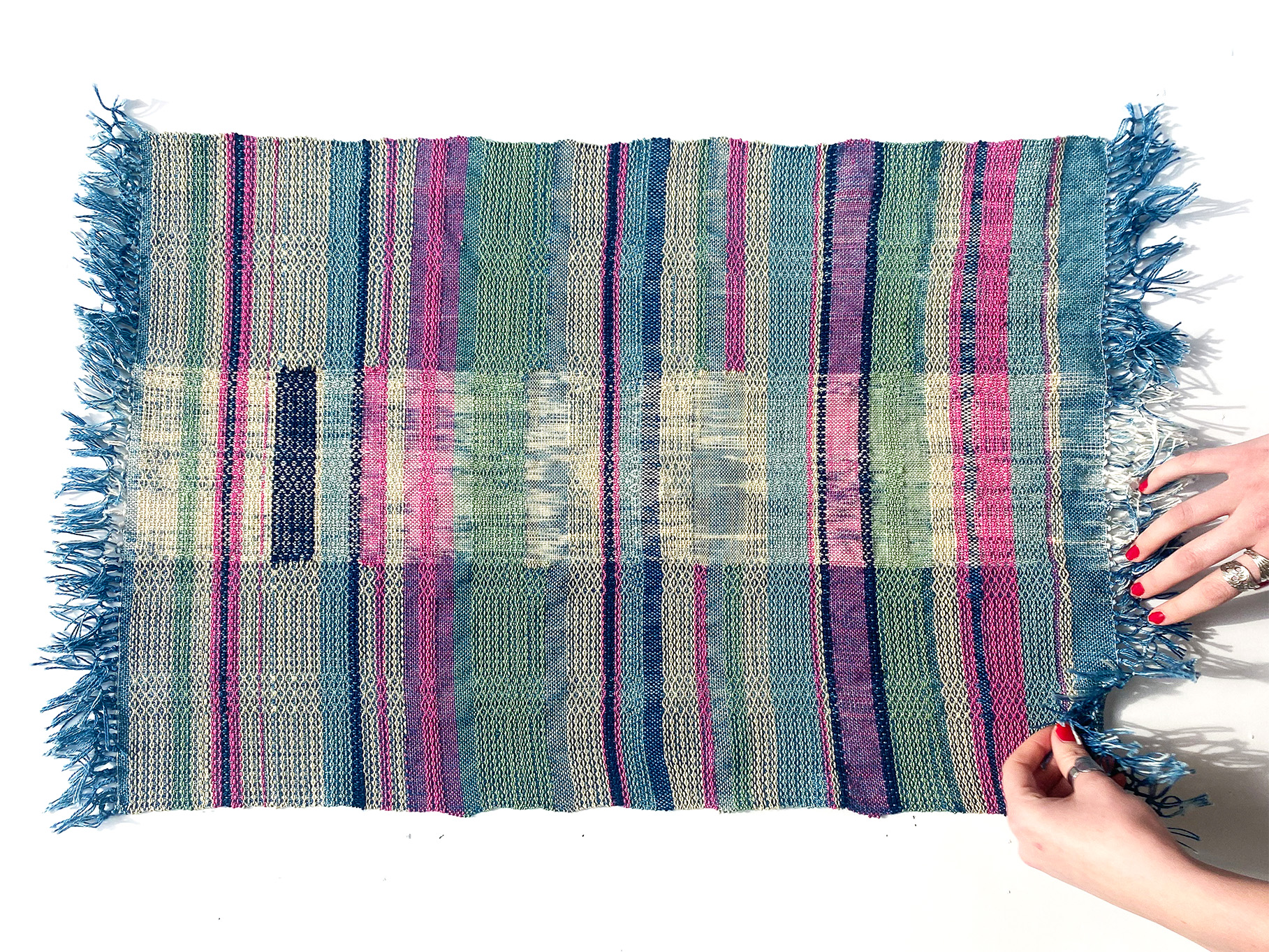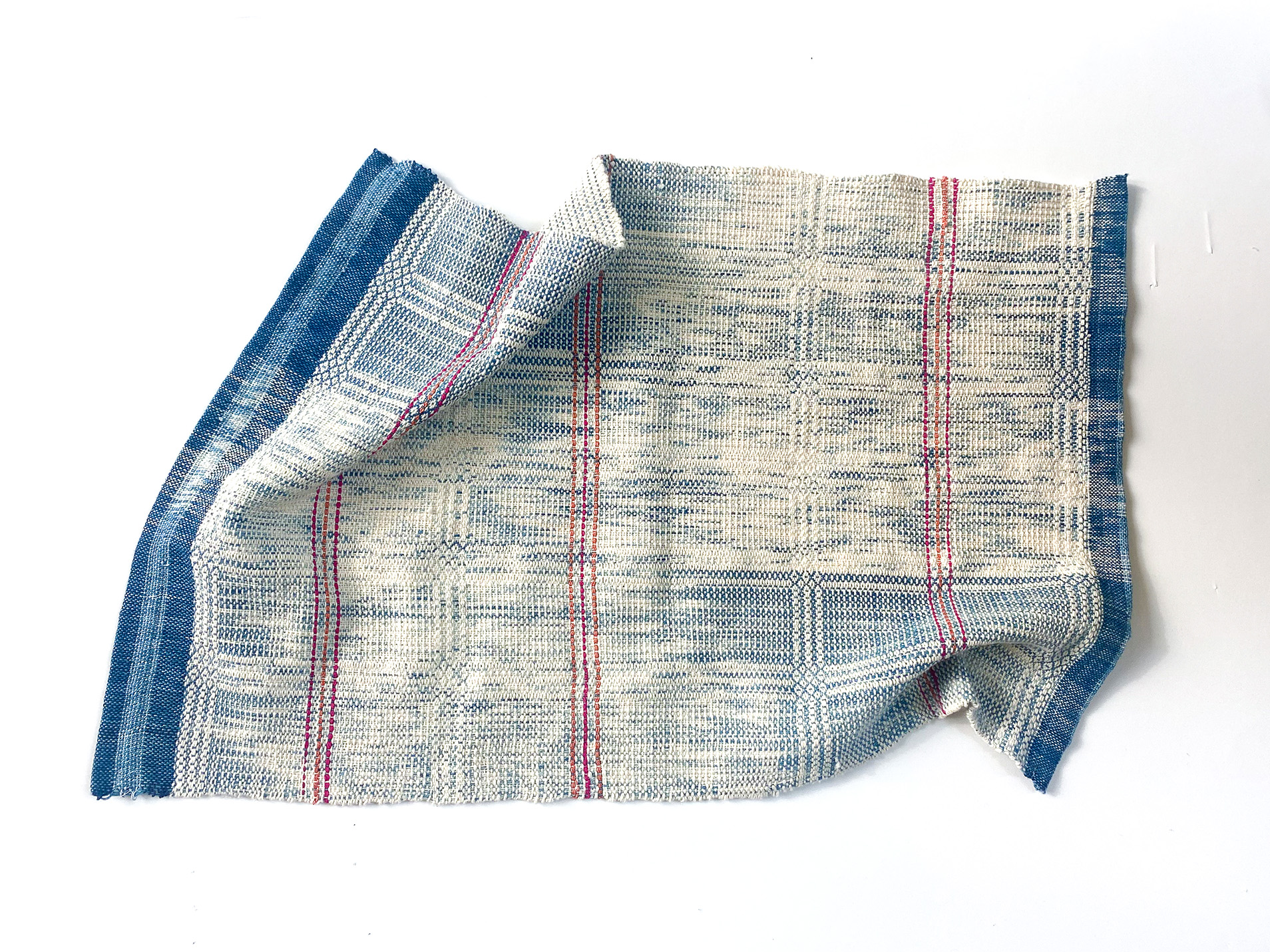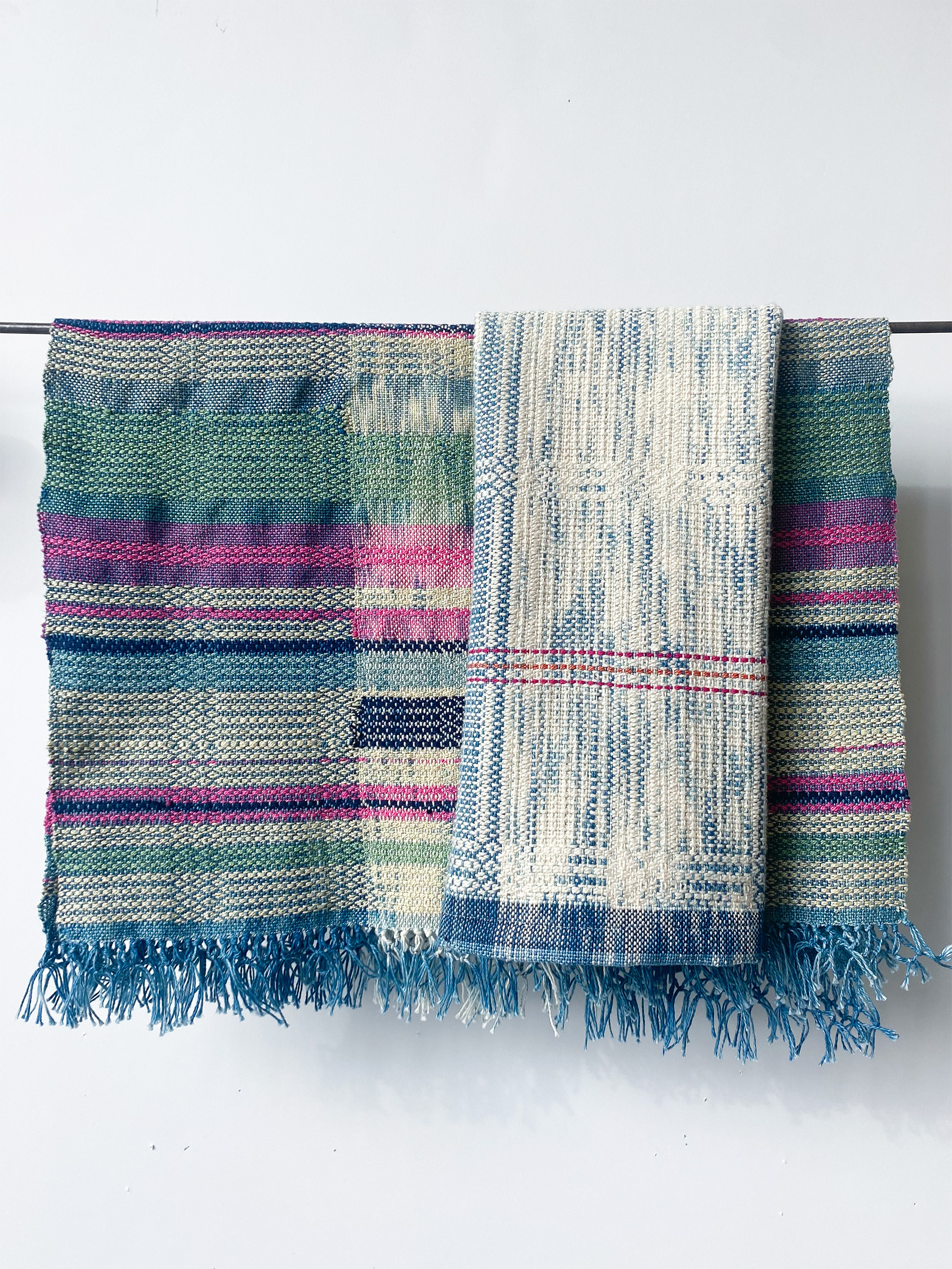 Two woven towels inspired by the waterways of Wisconsin. Warp dyed by the artist with indigo. Not for sale.